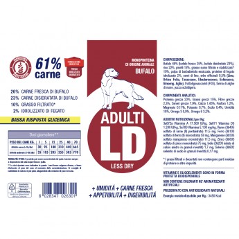 Nuova linea Adulti Less Dry (LD). Il primo estruso al 18% di acqua: aumentando l'umidità migliorano sia appetibilità che digeribilità. Questa nuova formulazione non rende necessario reidratare l'alimento secco.
