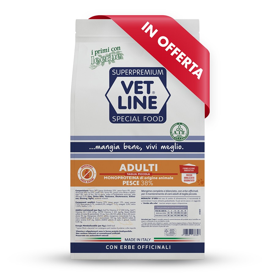 Integrata con sette erbe officinali titolate che aiutano a prevenire parassiti, infezioni batteriche e virali, disturbi digestivi, e innalzano le difese immunitarie. Pur essendo destinata a cani che non manifestano intolleranze alimentari, è stato seguito anche in questa formula il concetto di alimentazione olistica di tutta la linea Vet Line, utilizzando una sola fonte proteica: pesce fresco, idrolizzato e disidratato ed una fonte glucidica senza i glutini allergizzanti e lieviti.