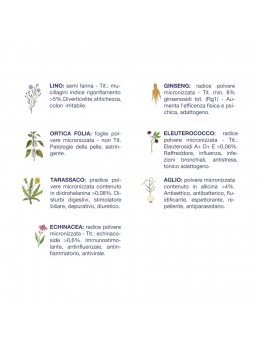 Pressato a freddo e con erbe officinali (Lino, Ortica Folia, Tarassaco, Eleuterococco, Echinacea, Ginseng, Aglio).